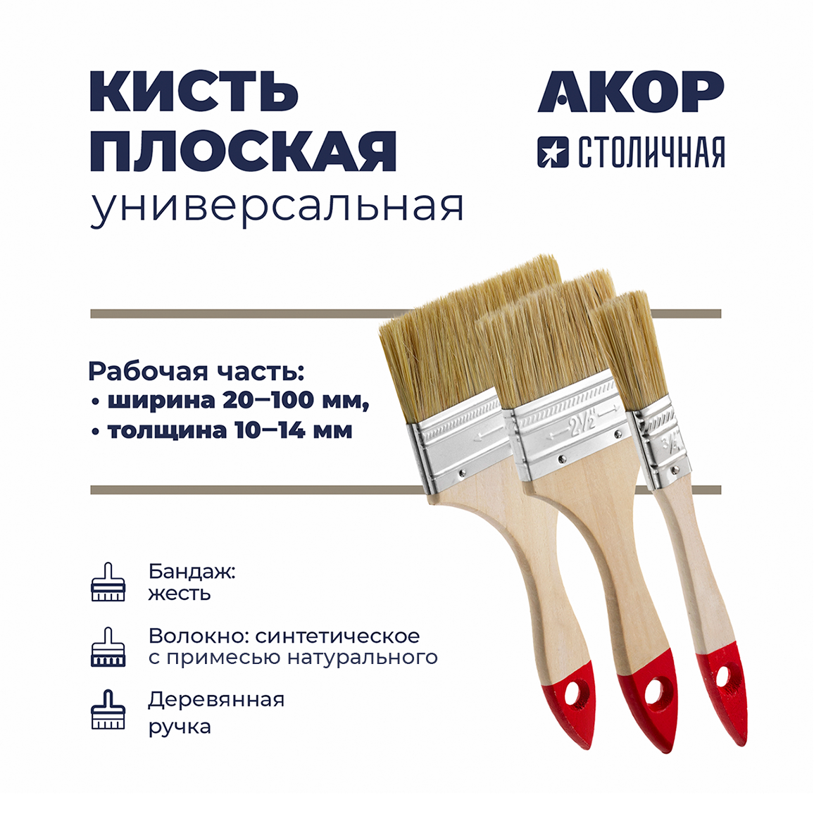 Кисти плоские универсальные, ширина 20–100 мм, толщина 10–14 мм, деревянная ручка, Столичная
