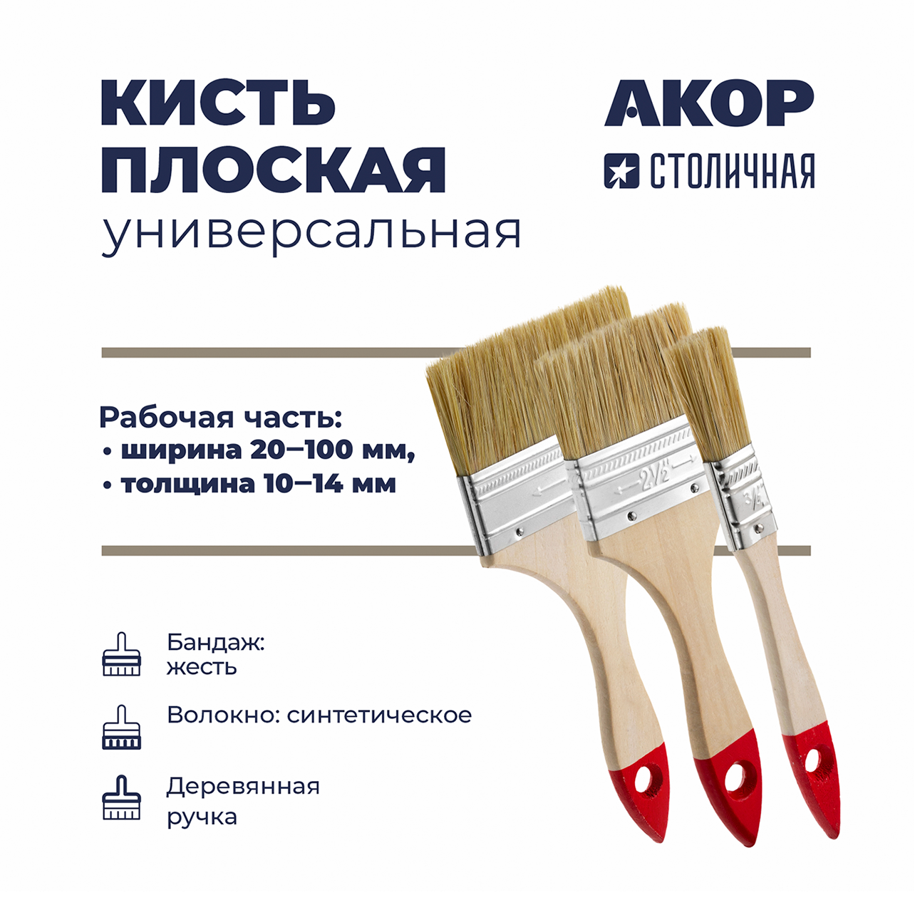 Плоские универсальные кисти ТМ Столичная. Ширина от 20 до 100 мм, толщина 10, 12 и 14 мм, синтетическое волокно. Бандаж из жести. Деревянная ручка с отверстием для подвеса. Произведены в Китае.