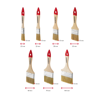Плоские универсальные кисти ТМ Столичная. Ширина щетины от 20 до 100 мм, толщина от 10 до 12 мм, смесь синтетического и натурального волокна. Бандаж из жести. Деревянная ручка с отверстием для подвеса. Произведены в Китае.