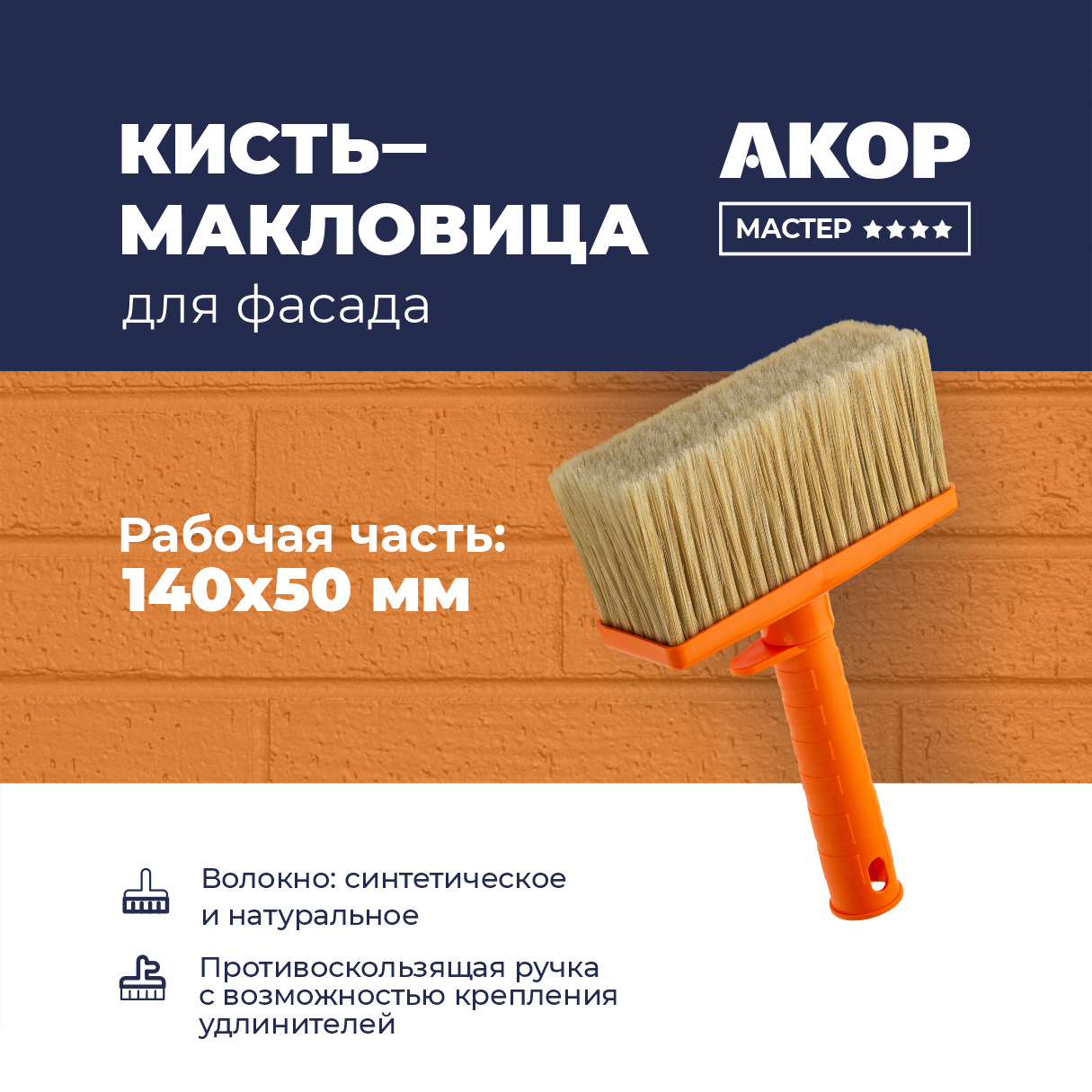Рабочая часть кисти состоит из специально подобранного и подготовленного для фасадов набора синтетических и натуральных волокон.