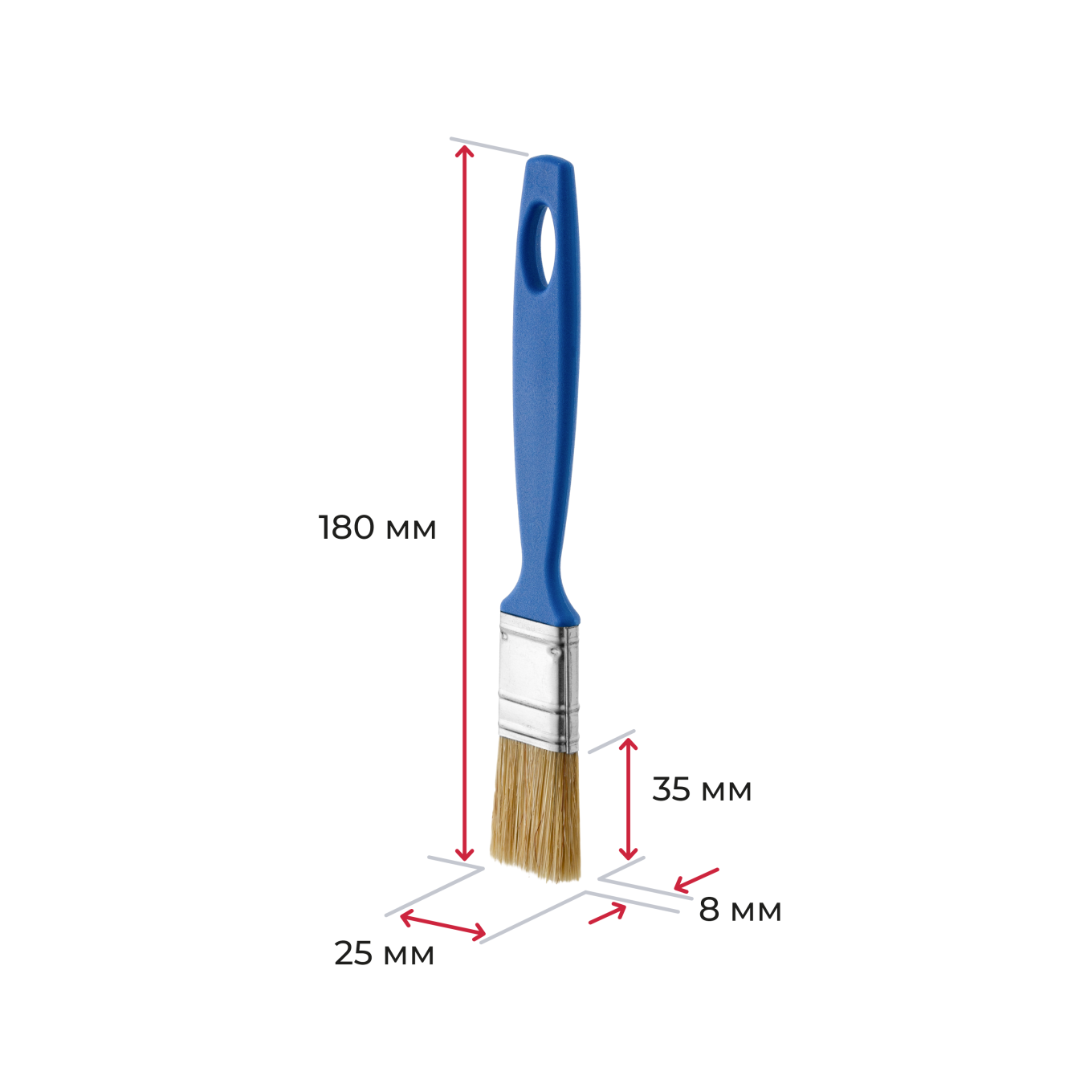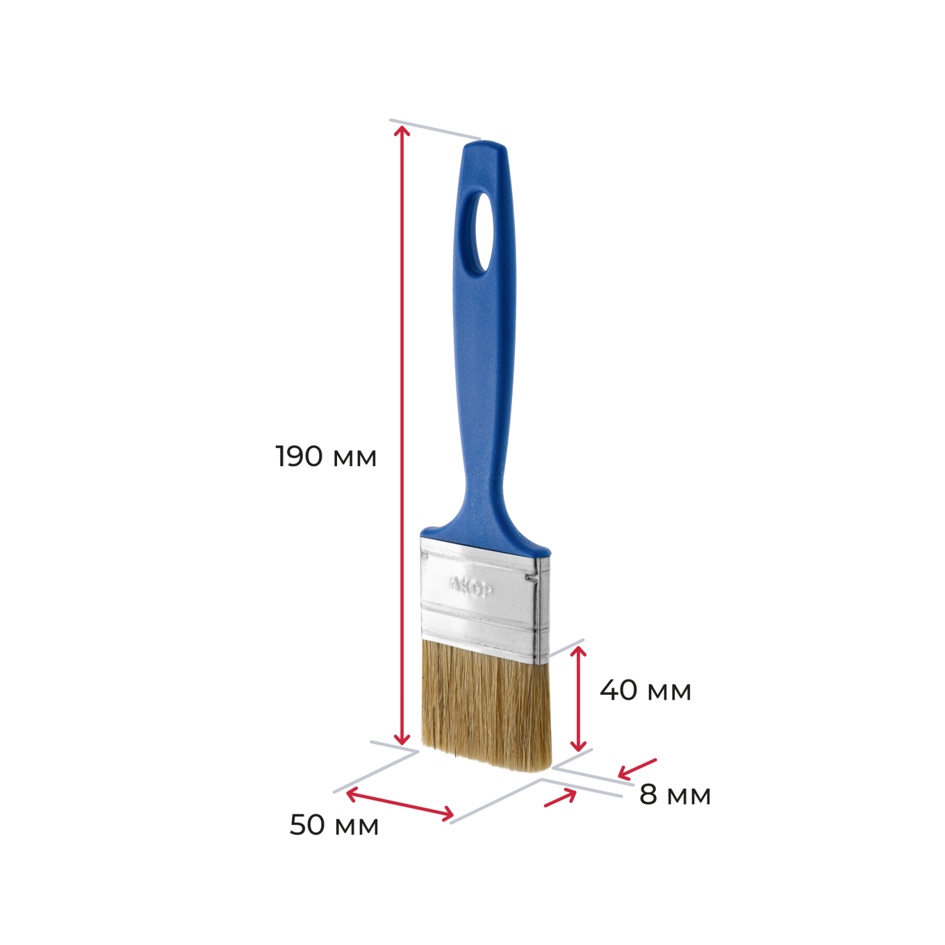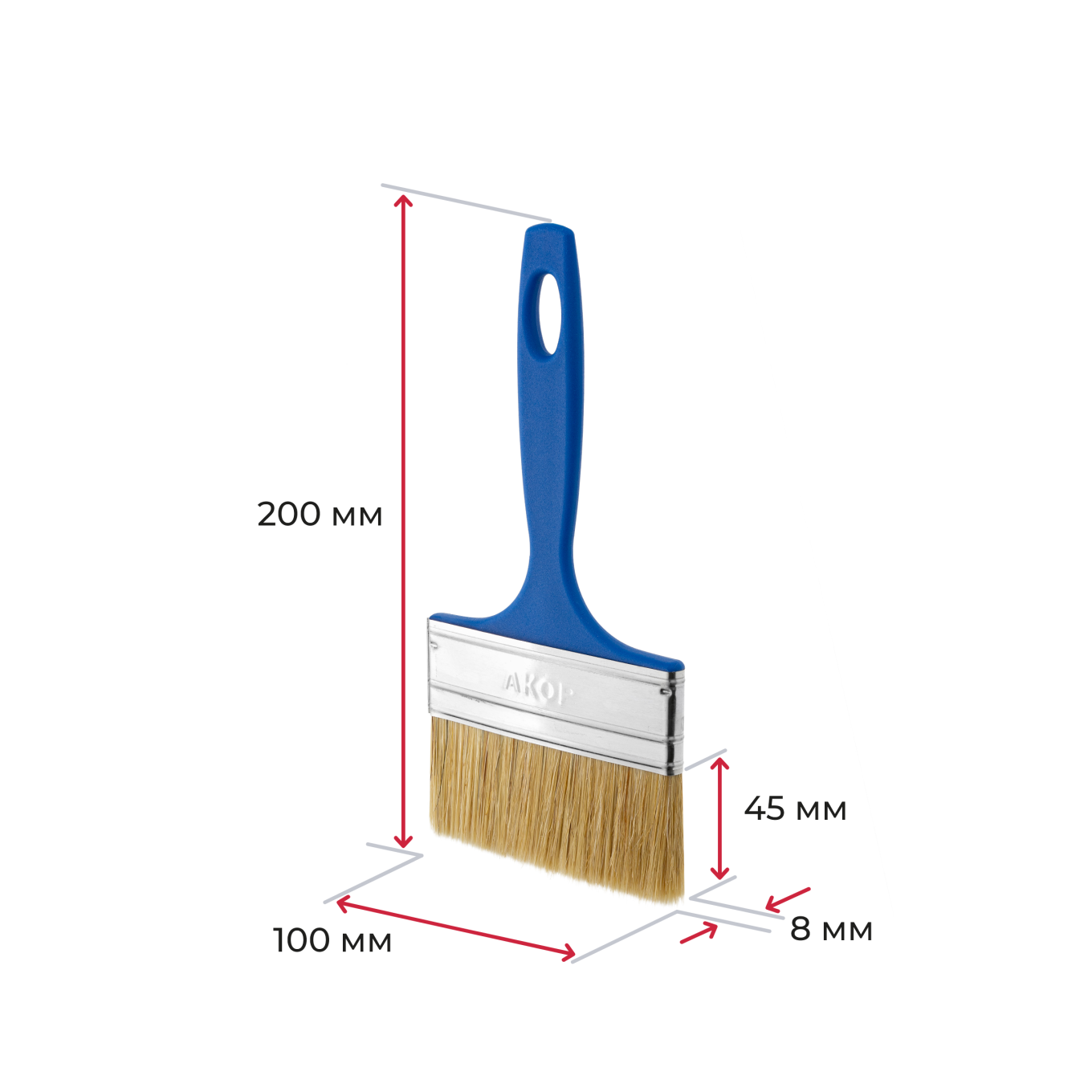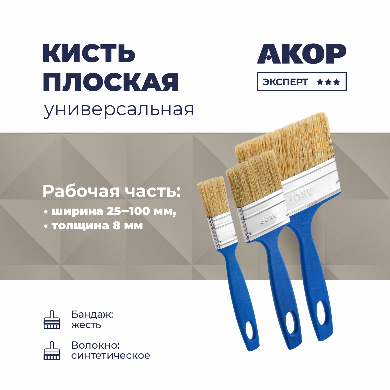 Плоские универсальные кисти серии «Эксперт». Ширина от 25 мм до 100 мм, толщина 8 мм, синтетическое волокно с кончиком в форме конуса. Бандаж из жести. Пластиковая ручка с отверстием для подвеса. Произведены в г. Новосибирск.