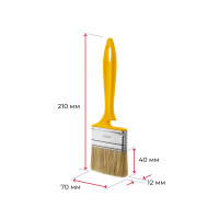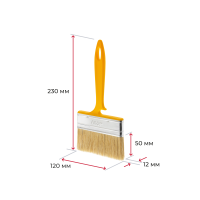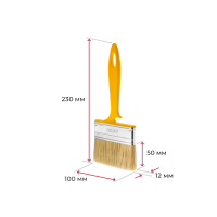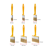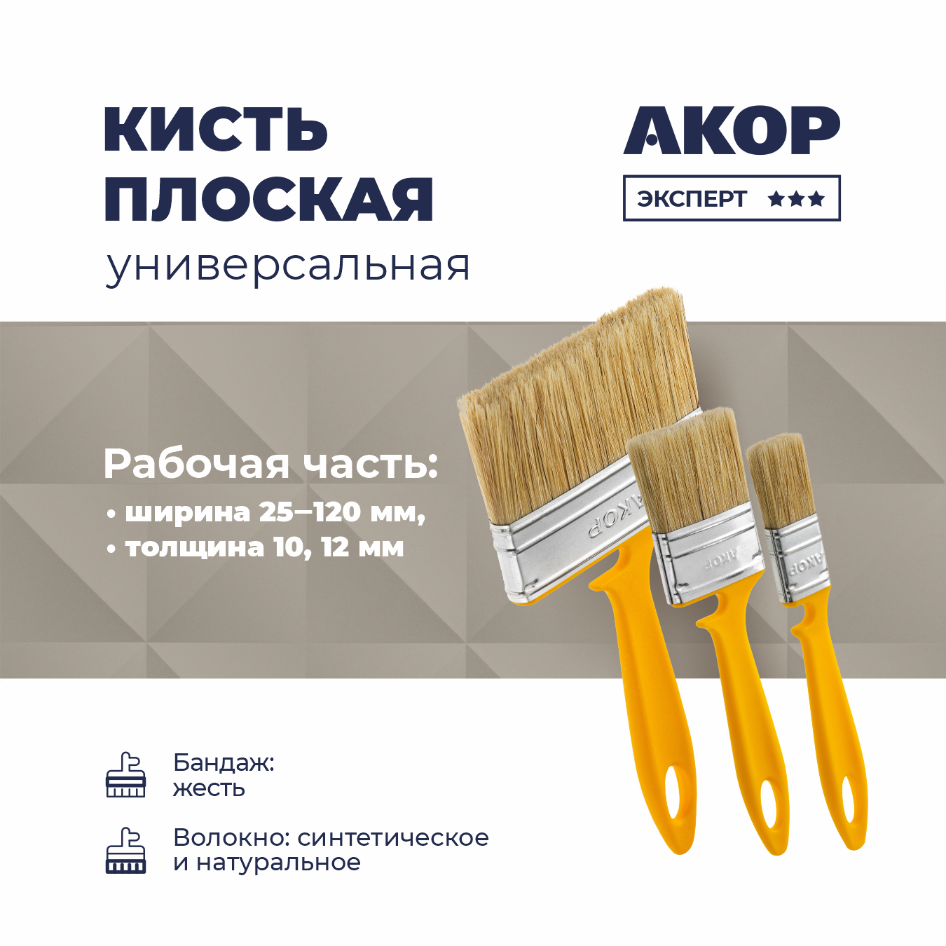 Плоские универсальные кисти серии «Эксперт». Ширина от 25 мм до 120 мм, толщина 10 и 12 мм, смесь синтетического и натурального волокна с кончиком в форме конуса. Бандаж выполнен из жести. Пластиковая ручка с возможностью крепления на емкости с краской и отверстием для подвеса. Произведены в г. Новосибирск.