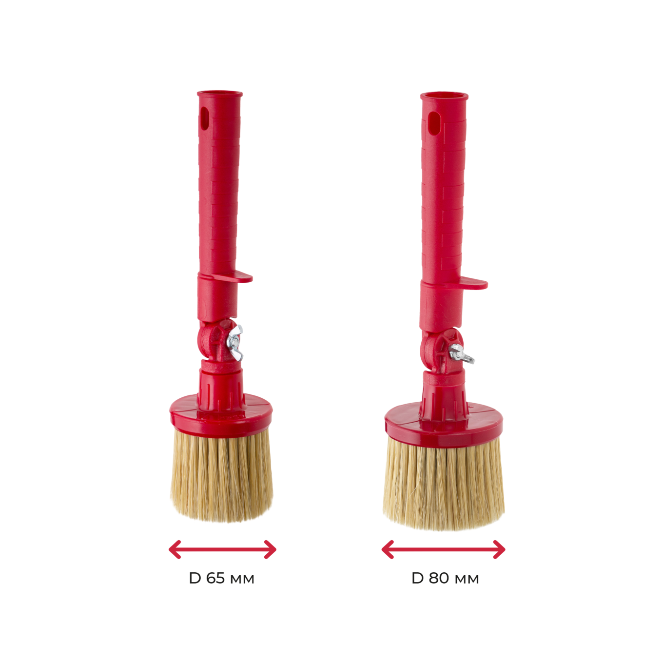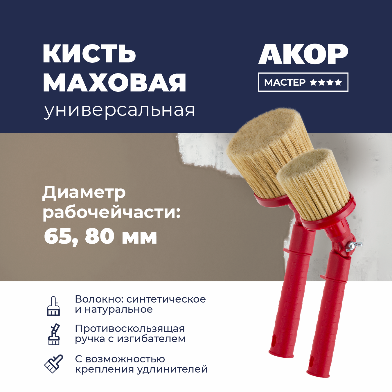 Диаметр щетины 65 и 80 мм, смесь синтетического и натурального волокна с кончиком в форме конуса.